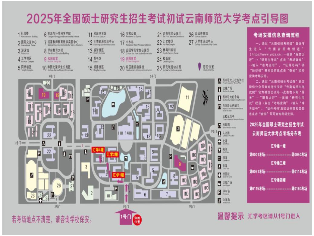 非我校应届在校考生从指定的通道--云南师范大学呈贡校区1号门进入;我校应届在校考生从汇学3幢、汇学4幢中间的通道进入;其它校门入口不允许考生进入。