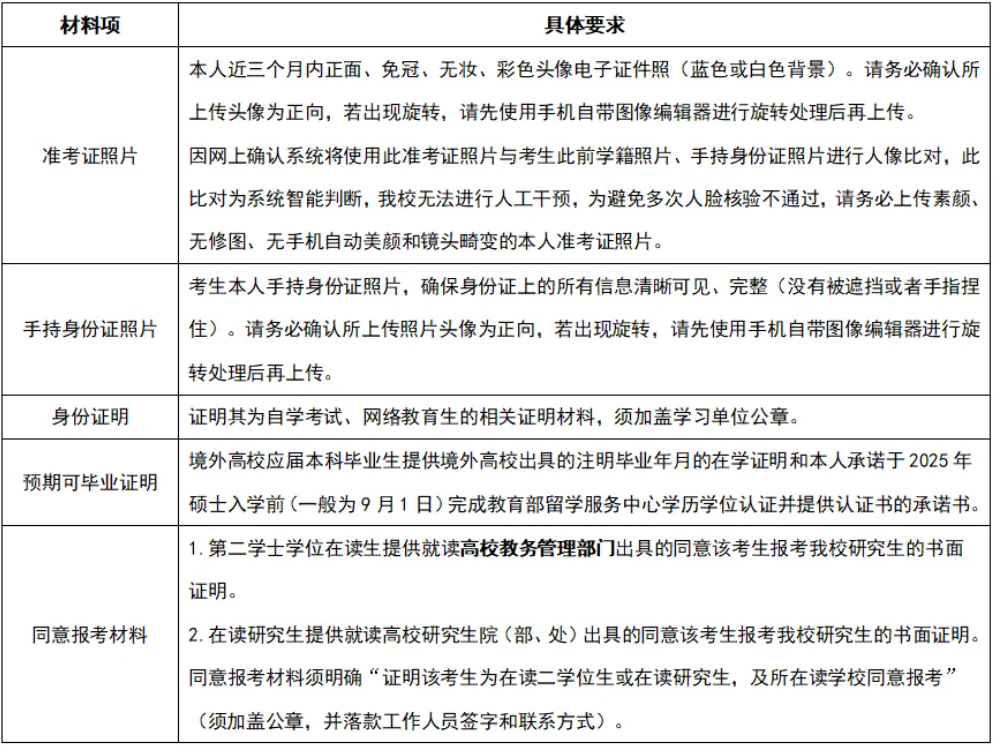 注意:网上确认时,下表所列材料均须提供清晰、可阅读的彩色jpg格式图片(照片或电子扫描件)。网上确认期间请留存所有材料原件备查,如核查发现材料存疑等情况,考生需按我校审核意见提供相应材料。