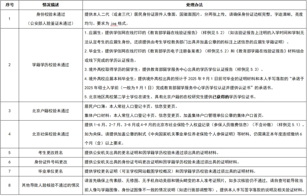经教育部、北京市对考生报名信息校验,考生如出现以下情况,请按对应处理办法上传证明材料。