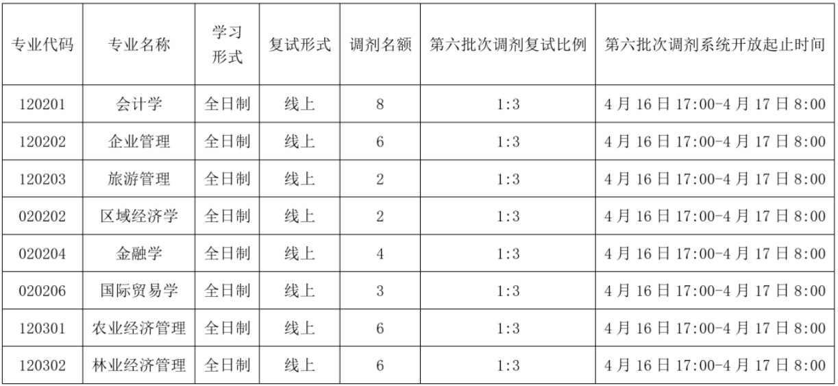 根据《福建农林大学2025年招收攻读硕士学位研究生复试录取办法》《经济与管理学院2025年招收攻读硕士学位研究生复试录取工作实施细则》及相关文件要求,现将经济与管理学院2025年硕士研究生招生调剂(第六批次)公告如下: