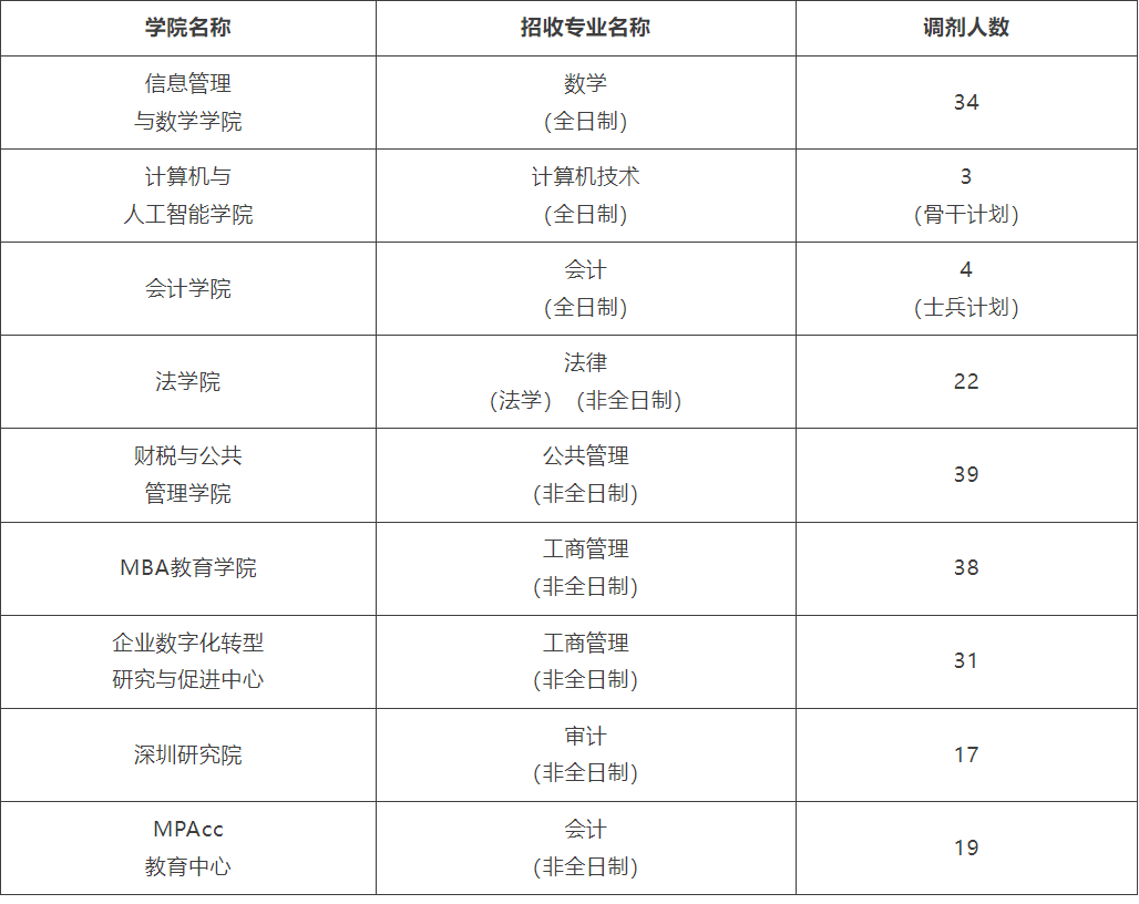 贵州财经大学2025年硕士研究生招生考试调剂公告各位考生:根据教育部《2025 年全国硕士研究生招生工作管理规定》(教学〔2024〕4 号)以及贵州省教育厅相关文件精神,我校 2025 年硕士研究生招生工作中,部分专业尚有调剂名额。现将调剂的相关事宜告知如下,请有意向调剂的考生密切关注学校研究生院官方网站,提前做好调剂的各项准备工作。一、调剂专业表一、学术学位表二、专业学位二、考生调剂基本条件符合调入专业的报考要求。初试成绩达到第一志愿报考专业在调入地区的全国初试成绩基本分数线。遵循在同一学科门类范围内,调入专业与第一志愿报考专业相同或相近的原则,同时结合学校的培养需求等制定具体的调剂报考条件。初试科目与调入专业初试科目相同或相近。第一志愿报考工商管理、公共管理、会计、旅游管理、图书情报、工程管理、审计等 7 个专业学位的考生,仅可在这几个专业之间相互调剂,不得调入其他专业,其他专业的考生也不能调入这几个专业。第一志愿报考法律(非法学)专业学位硕士的考生,不得调入其他专业,其他专业的考生同样不能调入该专业。报考 “少数民族高层次骨干人才计划” 的考生,不能调剂到该计划之外录取;未报考该计划的考生,也不能调剂到该专项计划。报考 “退役大学生士兵计划” 的考生,若申请调剂到普通计划,其初试成绩必须达到调入地区相关专业所在学科门类的全国初试成绩基本要求。符合条件的考生,可按照规定享受退役大学生士兵初试加分政策。报考普通计划的考生,若符合 “退役大学生士兵计划” 报考条件,可申请调剂到该专项计划,其初试成绩须符合相关招生单位确定的接受 “退役大学生士兵计划” 考生调剂的初试成绩要求。对于 “退役大学生士兵计划” 和普通计划之间的调剂,学校会严格依照调剂程序和要求进行,不得直接更改考生志愿、调整计划类型来进行复试录取。参加单独考试(包括强军计划、援藏计划)的考生,不允许调剂。我校各调剂专业的具体调剂条件,可查看正式调剂系统。遵守教育部、贵州省规定的其他调剂政策。三、调剂原则对于符合调剂条件的考生,按照其初试成绩总分从高到低的顺序,择优筛选进入调剂复试的名单。本次调剂中,指标未完成的专业,其缺额指标由学校统一统筹安排。四、调剂程序我校将于 2025 年 4 月 8 日 00:00 至 2025 年 4 月 8 日 12:00 开放调剂系统,开放时长为 12 小时。所有符合调剂条件且申请调剂的考生,都必须通过教育部指定的 “全国硕士生招生调剂服务系统”(https://yz.chsi.com.cn/yztj/,简称 “调剂服务系统”)进行操作。学校会对调剂考生的资格进行审核,并通过中国研究生招生信息网及时向考生发送复试通知。收到复试通知的考生,必须在规定时间内在调剂服务系统内回复确认,逾期未确认的,将视为自动放弃资格。关于调剂志愿锁定时间,申请调剂到我校的考生,经本人提出申请后,可以解除锁定;未自主申请解除锁定的考生,在当次调剂工作完成后,将一次性全部解除锁定。已接收调剂到我校并确认参加复试的考生,在其所在专业调剂复试工作完成之前,不得解除锁定。五、调剂复试时间和方式复试采取到校线下的方式进行。具体的复试时间和地点,由各学院确定后另行通知。考试时间以北京时间为准,每科开考 15 分钟后,考生不得入场,考生需严格遵守考场规则。六、调剂复试资格审查复试资格审查工作由相关学院具体负责,审查必须严格执行。资格审查考生范围:收到我校同意参加复试通知的调剂考生,需按要求向相关学院提交资格审查材料;资格审查合格的考生方可参加复试,资格审查不合格的考生,不予复试。复试前未按规定提交资格审查材料的考生,视为自动放弃复试资格。资格审查内容考生的准考证、居民身份证、学历学位证书(应届本科毕业生需交验学生证,毕业证书在入学时交验,考生入学时若不能按要求提供毕业证,其录取资格无效)、学历学籍核验结果、思想政治考核表(见附件 1)等。达到享受少数民族照顾政策国家线并参加复试的应届考生,除提交上述第 1 条所含的审查材料外,还须提交户籍证明原件(户籍在民族区域自治地方)和研究生毕业后在国家公布的民族区域自治地方就业的承诺书、定向培养(就业)协议书(见附件 2)等。达到享受少数民族照顾政策国家线并参加复试的非应届在职人员考生,除提交上述第 1 条所含的审查材料外,还须提交户籍证明原件(户籍在民族区域自治地方)和现在国家公布的民族区域自治地方工作的单位在职证明以及签订的定向培养(就业)协议书(见附件 2)等。享受初试加分政策的 “大学生志愿服务西部计划”“三支一扶计划”“农村义务教育阶段学校教师特设岗位计划”“国际中文教育志愿者” 等项目的考生,应在中国研究生招生信息网公布的名单中,并需提交相应的证明材料。享受 “退役大学生士兵” 初试加分政策的考生和 “退役大学生士兵专项计划” 考生,还须提供《入伍批准书》和《退出现役证》等材料。同等学力考生需提供相应的毕业材料。提前毕业的考生要提供其所在学校出具的修完学分、能够提前毕业的证明。提交材料与报名信息不符或资格审查不合格的考生,将取消其复试资格。考生需签订诚信复试承诺书(见附件 3)。在复试、录取过程中,一旦发现考生