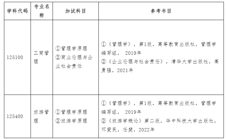 根据教育部《2025年全国硕士研究生招生工作管理规定》第五十五条,现将我院2025年工商管理硕士(125100)、旅游管理硕士(125400)两个专业学位同等学力考生复试加试科目及参考书目公布如下: