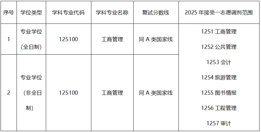 北京林业大学2025年MBA接收第二批次调剂公告鉴于我校 2025 年 MBA(非全日制)招生指标出现新增情况,现决定开启第二批次调剂工作,本次调剂计划名额为 20 名。为方便符合条件的考生顺利报名,现将相关事宜公告如下,诚邀满足要求的考生踊跃参与调剂申请。一、调剂报考条件本次调剂面向报考管理类联考相关专业的考生,具体涵盖公共管理 MPA(专业代码 1251)、会计 MPAcc(专业代码 1253)、旅游管理 MTA(专业代码 1254)、图书情报 MLIS(专业代码 1255)、工程管理 MEM(专业代码 1256)以及审计 MAUD(专业代码 1257)。考生需同时满足以下两项要求:一是符合北京林业大学 MBA 专业的报考基本条件;二是其第一志愿专业成绩达到国家 A 类考生基本分数线标准。二、调剂复试相关安排(一)调剂系统开放时段考生需通过中国研究生招生信息网的 “全国硕士生招生调剂服务系统” 进行报名,该系统将于 2025 年 4 月 10 日 18:00 正式开通,且开放时长不少于 12 小时,请考生务必在规定时间内完成填报。(二)调剂复试具体时间2025 年 MBA 第二批次调剂复试定于 2025 年 4 月 11-12 日举行,关于每位考生的具体复试时段,学校将通过电话形式单独通知,请考生保持通讯畅通,避免错过重要信息。(三)调剂复试开展形式受极端天气预警影响,为保障考生及工作人员安全、确保复试顺利进行,本次调剂复试将采用线上方式开展,相关线上复试平台及操作指南将随具体复试通知一并告知。(四)复试内容与其他事项有关本次调剂复试的具体内容,包括考核科目、评分标准等,以及复试流程、所需材料准备等其他注意事项,考生可查阅《北京林业大学 2025 年工商管理硕士(MBA)调剂考生招生复试录取工作方案》该方案可通过以下链接访问:https://em.bjfu.edu.cn/rcpy/yjsjy/tzggy/e7a44228294c4373b23b6734d2e03547.htm。三、MBA 调剂工作联系信息为便于考生咨询调剂相关问题,现将本次 MBA 调剂工作的联系人及联系方式等信息公布如下:北京林业大学 MBA 教育中心2025 年 4 月 10 日2025-09-05 12:29:44
