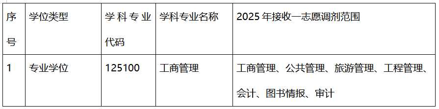 工商管理学院 2025年工商管理学学术硕士研究生招生 调剂公告(三)一、可调剂专业我院工商管理学一级学科硕士点在本年度有新增调剂名额,涉及以下四个学科方向:企业管理(120202)、旅游管理(120203)、技术经济及管理(120204)、人力资源管理(1202Z1)。二、调剂报考要求考生初试的单科成绩与总成绩均需达到国家划定的 A 类考生地区复试基本分数线;经本院学位评定委员会审核,调剂考生第一志愿报考专业的代码前四位需为 1202 或 1201;统考科目须保持一致,业务课考试科目应相同或相近;外国语考试科目限定为英语一;需满足教育部及重庆工商大学关于调剂的其他相关规定。三、调剂系统开放时段2025年4月11日 12:15—4月12日 18:00四、调剂复试安排调剂复试时间为 2025年4月13日下午12:30—18:00。有意向调剂至我校的考生,请提前做好准备工作与行程规划。复试具体安排将及时通过工商管理学院网站(https://mc2014.ctbu.edu.cn)发布。 复试相关须知可参考《重庆工商大学 2025 年工商管理学硕 国际商务专业硕士一志愿考试考生须知》及附件《重庆工商大学工商管理学院 2025 年硕士研究生招生复试和录取工作方案(工商管理学硕 国际商务专硕)》,调剂考生与一志愿考生的复试流程和要求一致。请各位考生密切关注学院网站信息。考生进校时需出示 2025 年全国硕士研究生招生考试(初试)准考证与身份证。考生需在规定时间内登录中国研究生招生信息网调剂系统,确认接受待录取后,即完成调剂复试及拟录取流程。若未在规定时间内通过 “调剂系统” 确认待录取,将被视为自动放弃。联系人:张老师联系电话:023-62769317(办公室电话)重庆工商大学工商管理学院2025 年 4 月 11 日2025-09-03 11:11:51