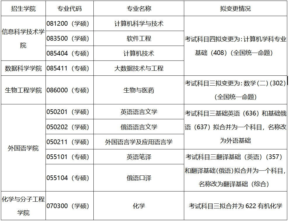 南信大-关于调整2025年硕士研究生招生考试部分初试和复试科目的通知各位考生:为进一步优化硕士研究生招生考试科目设置,根据上级部门相关文件要求,经有关招生学院申请,学校审核同意,拟对我校2025年部分硕士研究生招生专业考试科目进行调整,方案如下:一、003大气物理学院,0706Z3大气遥感与大气探测专业,考试科目:由810雷达与卫星气象学,调整为810大气探测学;由F08大气探测学,调整为F08雷达与卫星气象学,即初试第四单元考试科目和复试笔试科目互换,大纲见附件1。二、004地理科学学院,0706Z5 3S集成与气象应用专业,考试科目:由807遥感原理,调整为814遥感原理与应用,大纲见附件2。三、005遥感与测绘工程学院,考试科目:814遥感原理与应用,考试大纲内容调整,见附件2。四、007海洋科学学院,070702海洋化学专业改为070703海洋生物学专业招生,考试科目不变;085903海洋工程专业考试科目:由841普通物理(力学),调整为840大学物理。五、009自动化学院,085510机器人工程专业和085509智能制造技术专业,考试科目:由845机械原理,调整为817自动控制原理;085411大数据技术与工程专业和085400电子信息(大数据技术与工程,雷丁中外)专业,考试科目:由815数据结构II,调整为816数据结构与算法设计,考试大纲见附件3。六、010电子与信息工程学院,080900电子科学与技术和085401新一代电子信息技术(含量子技术等)专业,考试科目:由837电路分析,调整为811信号与系统。七、011计算机学院、网络空间安全学院,081200计算机科学与技术专业、085404计算机技术专业、085412网络与信息安全专业和085400电子信息专业(沃特福德学院-中外合作办学),考试科目:均由816数据结构,调整为统考科目408计算机学科专业基础。八、016管理工程学院,1201J1应急管理专业,考试科目:由818应急管理原理,调整为819管理学原理。九、018文学院,050201英语语言文学专业,考试科目:由705英语基础阅读,调整为705英语翻译与写作;由839英语翻译与写作,调整为839英语基础阅读,大纲见附件4。050202 俄语语言文学专业,考试科目:由709俄语基础阅读,调整为709俄语翻译与写作;由824俄语翻译与写作,调整为824俄语基础阅读,大纲见附件4。050205 日语语言文学专业,考试科目:由708日语基础阅读,调整为708日语翻译与写作;由822日语翻译与写作,调整为822日语基础阅读,大纲见附件4。055101英语笔译专业,考试科目:由357英语翻译基础,调整为705英语翻译与写作,大纲见附件4。055105日语笔译专业,考试科目:由359日语翻译基础,调整为708日语翻译与写作,大纲见附件4。十、022人工智能学院,0810J2人工智能专业和085410人工智能专业,考试科目:由835数据结构与算法分析,调整为816数据结构与算法设计,大纲见附件3。十一、023软件学院,083500软件工程专业和085405软件工程专业,考试科目:由844数据结构与算法II,调整为816数据结构与算法设计,大纲见附件3。十二、024应急管理学院,1201J1应急管理专业,考试科目:由818应急管理原理,调整为819管理学原理;复试科目由F56安全科学基础,调整为F21统计学概论,大纲见附件5。此外,026集成电路学院,2025年拟招生专业085403集成电路工程,初试科目第四单元与010电子与信息工程学院,085402通信工程(含宽带网络、移动通信等)专业第四单元考试科目相同,为811信号与系统。请广大考生知悉,后期上级部门若有政策调整,将最终以《2025年南京信息工程大学硕士研究生招生专业目录》发布为准。附件扫码查看下载2025-08-13 10:05:08