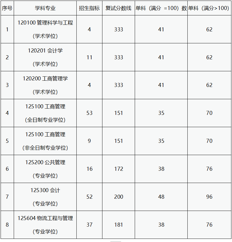 管理科学与工程(120100)、工商管理学(120200)、会计学(120201)专业总成绩计算公式(百分制)=初试总分÷5×70%+(专业理论成绩×50%+综合素质成绩×30%+外语口语听力成绩×20%)×30%。