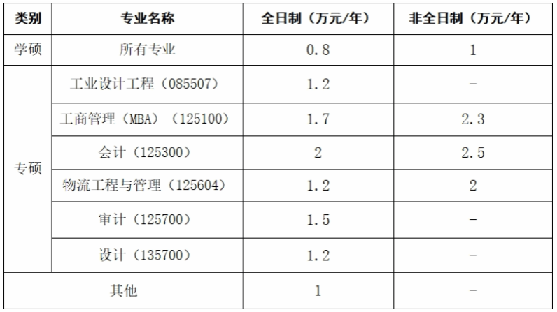 全日制研究生:学习方式为全脱产,非全日制研究生:学习方式为全脱产或半脱产;所有专业学制3年。收费标准见下表: