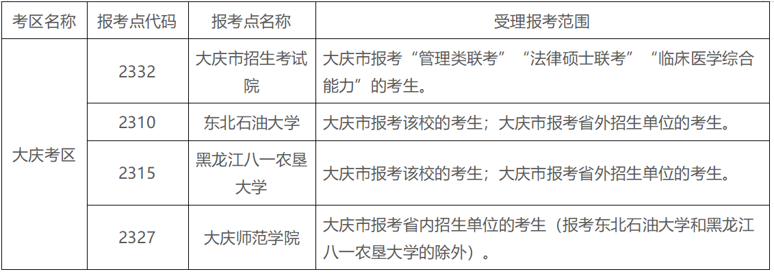 2025年黑龙江省硕士研究生报名共设8个考区35个报考点,各报考点的行政区域划分和受理报考范围均有严格限制,考生必须按限定条件选择报考点报名,详见《黑龙江省2025年全国硕士研究生招生考试网上报名公告》,大庆考区设有4个考点,见下图:
