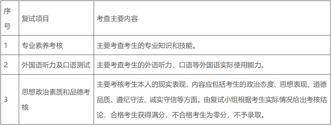 1.复试成绩满分300分。其中专业考核成绩满分210分(管理类联考相关专业的政治考核60分,专业考核150分),外语听说能力测试满分60分,思想政治考核满分30分。凡复试总成绩低于180分或思想政治考核不合格的,即为复试不合格,不予录取。