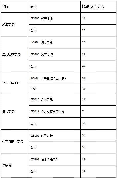 南华大学经济管理与法学学院关于2025年硕士研究生招生调剂相关事项的通知根据《南华大学2025年硕士研究生复试录取工作方案》及《南华大学经济管理与法学学院2025年硕士研究生复试录取工作方案》的具体要求,我院各专业调剂系统开放的时间为2025年4月8日00:00-14:00,为切实做好学院硕士研究生调剂复试工作,特制订本调剂规则。1.基本调剂原则初试成绩须符合第一志愿报考专业在2025年A类考生全国初试成绩基本要求,且达到A类考生调入专业全国初试成绩的基本要求;符合教育部、湖南省及我校2025年相关调剂政策。2.具体调剂规则(1) 020200应用经济学(缺额12个左右):与调入专业初试科目相同或相近,即统一命题科目中包含政治、英语(英语一、英语二视为相同)、数学(数学一、数学二、数学三、经济类综合能力视为相同),第一志愿报考专业原则上应为经济学类专业(报考专业代码前两位为02)。(2)120200工商管理学(缺额20个左右):一志愿报考管理科学与工程(学科代码1201)、工商管理学(学科代码1202)、农林经济管理(学科代码1203)、公共管理学(学科代码1204)、信息资源管理(学科代码1205)、理论经济学(学科代码0201)、应用经济学(学科代码0202)一级学科及二级学科的考生,初试成绩满足基本调剂原则的可接受调剂。工商管理学(会计学)方向申请调剂考生第一志愿报考专业或者本科专业原则上为财会相关专业。(3) 120400公共管理学(缺额4个左右):与调入专业的统考科目相同、专业课相近;单科满分100分的科目成绩≥60分的考生优先;第一志愿报考专业原则上应为管理学类专业。(4)035101法律硕士(非法学)(缺额7个左右):与调入专业统考科目相同。(5)035102法律硕士(法学)(缺额9左右) :与调入专业统考科目相同。(6)025100金融硕士(缺额24个左右):与调入专业统考科目相同、专业课相近,即统考科目中包含政治、英语、数学三或经济类综合能力、业务课二为经济类专业课程;第一志愿报考专业原则上应为经济学类专业(报考专业代码前两位为02)。(7)125100工商管理(全日制,缺额22个左右(含退役大学生士兵计划1个)):报考工商管理、公共管理、旅游管理、工程管理、会计、图书情报、审计专业学位硕士的考生,初试成绩满足基本调剂原则,且满足工商管理的报考条件(即大专毕业5年以上,本科毕业3年以上,硕士毕业2年以上)的考生,可以调剂。2025-08-27 10:27:22
