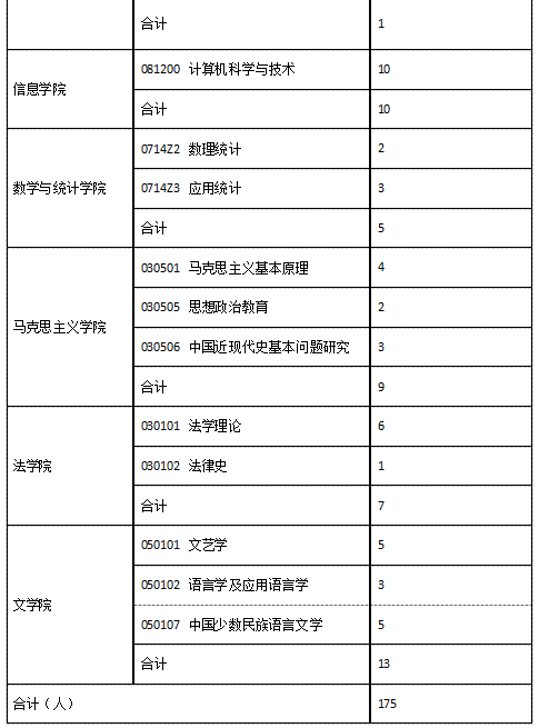 广西民族大学2025年硕士研究生招生调剂公告各位考生:现将我校 2025 年硕士研究生招生调剂的相关事宜通知如下:一、接收调剂考生的学科401 马克思主义学院有多个专业接收调剂,其中 030500 马克思主义理论(学术学位)和 030700 中共党史党建学(学术学位)调剂需求为少量;045102 学科教学(思政)(专业学位)调剂需求较多。402 政治与公共管理学院的 030200 政治学(学术学位)、120400 公共管理学(学术学位)、125200 公共管理(专业学位)均不需要调剂。403 经济学院的 020200 应用经济学(学术学位)、025100 金融(专业学位)、025300 税务(专业学位)、025400 国际商务(专业学位),调剂需求都为多。404 法学院中,030100 法学(学术学位)不需要调剂;035101 法律(非法学)(专业学位)调剂需求较多;035102 法律(法学)(专业学位)调剂需求为多;035400 知识产权(专业学位)调剂需求较多。405 民族学与社会学学院里,030400 民族学(学术学位)调剂需求为多,且仅 “中华民族学” 方向含 1 个 “少干计划” 接收调剂;035200 社会工作(专业学位)调剂需求少量;045109 学科教学(历史)(专业学位)调剂需求较多;060200 中国史(学术学位)调剂需求少量;065100 博物馆(专业学位)不需要调剂;145100 文物(专业学位)调剂需求较多。406 教育科学学院的 040100 教育学(学术学位)调剂需求较多;045101 教育管理(专业学位)调剂需求较多,该专业须符合下列条件之一:大学本科毕业后有 3 年以上工作经验的人员;或获得硕士、博士研究生学历或学位后有 2 年以上工作经验的人员;045116 心理健康教育(专业学位)调剂需求较多,且只招收本科专业属于心理学类(0711 等)的考生。407 体育与健康科学学院中,040300 体育学(学术学位)调剂需求少量,跨学科考生应符合《广西民族大学 2025 年硕士研究生招生专业目录》上规定的该专业报考要求;045201 体育教学(专业学位)不需要调剂;045202 运动训练(专业学位)调剂需求少量,仅有 2 个 “退役大学生士兵计划” 接收调剂,跨学科考生还须符合《广西民族大学 2025 年硕士研究生招生专业目录》上规定的该专业报考要求。408 文学院的 045300 国际中文教育(专业学位)调剂需求为多;050100 中国语言文学(学术学位)调剂需求较多。409 外国语学院里,045108 学科教学(英语)(专业学位)调剂需求较多,且只招收本科专业属于英语类专业(专业代码 050201、050261、050262 等)的考生;050200 外国语言文学(学术学位)调剂需求较多;055101 英语笔译(专业学位)调剂需求较多;055102 英语口译(专业学位)调剂需求较多。410 数学科学学院的 025200 应用统计(专业学位)调剂需求为大量;070100 数学(学术学位)调剂需求为多,含 1 个 “少干计划” 接收调剂。411 化学化工学院中,081700 化学工程与技术(学术学位)调剂需求为多;085600 材料与化工(专业学位)调剂需求为大量,含 1 个 “少干计划” 接收调剂。412 海洋与生物技术学院的 071000 生物学(学术学位)调剂需求较多,含 1 个 “少干计划” 接收调剂;086000 生物与医药(专业学位)调剂需求为多。413 物理与电子信息学院的 070200 物理学(学术学位)调剂需求较多,含 1 个 “少干计划” 接收调剂。415 管理学院里,120500 信息资源管理(学术学位)调剂需求较多;125100 工商管理(专业学位)、125300 会计(专业学位)、125500 图书情报(专业学位)均不需要调剂;125400 旅游管理(专业学位)调剂需求较多,须符合下列条件之一:大学本科毕业后有 3 年以上工作经验的人员;或获得硕士、博士研究生学历或学位后有 2 年以上工作经验的人员。416 艺术学院中,135200 音乐(专业学位)调剂需求较多;135700 设计(专业学位)不需要调剂。417 传媒学院的 055200 新闻与传播(专业学位)、135400 戏剧与影视(专业学位)调剂需求都为较多。418 东盟学院里,030200 政治学(学术学位)调剂需求较多;050200 外国语言文学(学术学位)调剂需求少量。425 东南亚语言文化学院中,050200 外国语言文学(学术学位)调剂需求较多;055117 泰语笔译(专业学位)调剂需求少量;055118 泰语口译(专业学位)、055121 越南语笔译(专业学位)不需要调剂;055122 越南语口译(专业学位)调剂需求少量。430 人工智能学院的 081200 计算机科学与技术(学术学位)调剂需求为大量,含 1 个 “少干计划” 接收调剂。431 材料与环境学院里,085700 资源与环境(专业学位)调剂需求为大量;140600 纳米科学与工程(学术学位)调剂需求为多。702 科技史与科技文化研究院的 071200 科学技术史(学术学位)调剂需求少量。说明:“调剂需求” 中,“少量” 代表调剂名额≦10;“较多” 指 10 < 调剂名额 < 25;“多” 为 25≦调剂名额 < 50;“大量” 则是调剂名额≧50。以上数据仅供参考,具体调剂名额要根据复试比例确定,考生可咨询相关招生学院。我校各专业调剂考生一志愿报考专业范围等要求,考生可查阅各学院的调剂细则或咨询相关学院。少数民族高层次骨干人才计划中,民族学 “中华民族学” 方向,数学、材料与化工、生物学、物理学、计算机科学与技术专业接收考生调剂,其余专业不接收该专项计划调剂。调剂该专项计划的考生,必须是生源地在广西、四川、甘肃、青海四个省份的少数民族考生,以及在上述地区工作满 3 年以上、报名时仍在当地工作的汉族考生。录取规则按照《广西民族大学 2025 年硕士研究生招生复试录取工作办法》执行。二、调剂条件详见《广西民族大学 2025 年硕士研究生招生调剂工作办法》。三、调