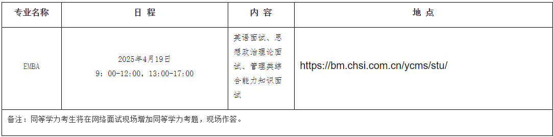 2025 年 4 月 17 日将进行资格审查,对于未提交材料或者审查未通过的考生,EMBA 中心会同时通过邮件和电话通知,请考生保持初试时预留的电话畅通。