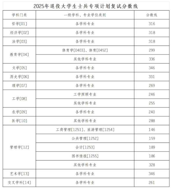 2025 年退役大学生士兵专项计划硕士研究生复试分数线按学科门类设定,具体数值如下表: