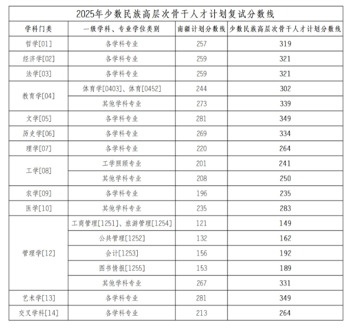 该计划 2025 年硕士研究生复试分数线按学科门类及专业类别划分,具体标准如下表所示: