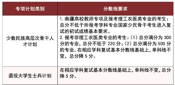 3.我校少数民族照顾政策按照教育部《2025年全国硕士研究生招生工作管理规定》执行。工作单位在国务院公布的民族区域自治地方,且定向就业原单位的少数民族在职人员考生,申请享受照顾政策的,须在网上报名时按要求填报相关信息。未按规定申报或审核未通过的,不享受照顾政策。学校将根据考生材料和有关部门反馈的名单进行审核。审核通过者可在相应普通计划学科分数线基础上总分降5分或一门单科降5分,考生在享受照顾政策后,分数不得低于享受少数民族照顾政策国家线有关要求。