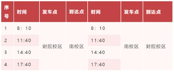 从2025年7月10日(星期四)—9月3日(星期三)开通南校区与财院校区之间的暑假班车(双休日正常休息),9月4日(星期四)恢复正常运行。