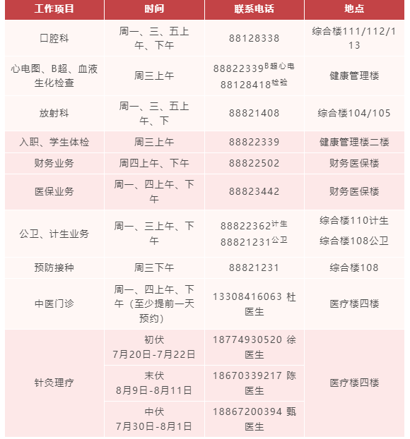1.南校区医院:实行24小时值班制。暑假期间继续开放门急诊(含发热门诊)和口腔科门诊。急诊、输液、抽血、换药等地点不变,均在医疗楼二、三楼。