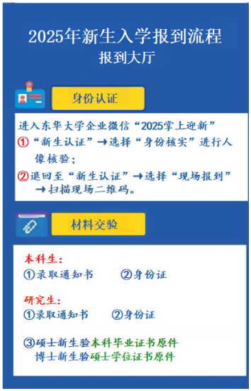 入学相关事务如有调整,以最新通知为准,请密切关注东华大学研究生招生官网、“东华研招”微信公众号、东华大学“迎新系统”、企业微信及各学院微信/QQ群内最新通知。