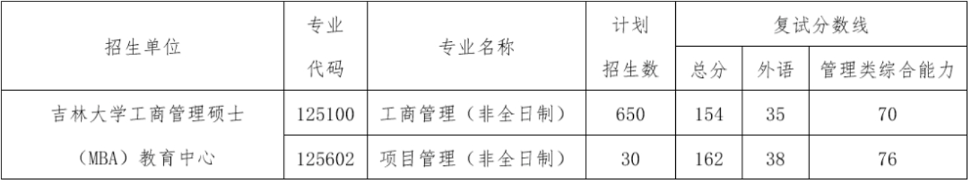 根据《吉林大学2025年硕士研究生招生复试录取工作办法》相关规定,现公布非全日制工商管理硕士(MBA)、项目管理硕士复试分数线。
