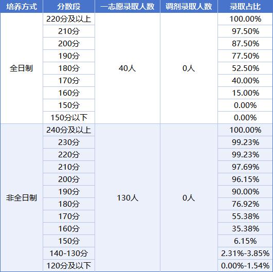 1. 全日制VS非全日制:门槛差异要分清:两类培养方式的分数要求很不一样哦!全日制更“挑分”,160分录取率才15%,170分直接涨到40%,180分以上才算稳(超50%),210分以上基本就妥了(97.5%+);非全日制宽容些,120分都有1.54%的机会,但160分以下录取率都低于35%,180分以上才比较有把握(76.92%)。简单说:全日制冲高分,非全也别掉以轻心!