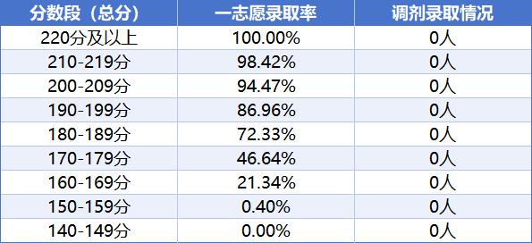 录取率简直是“阶梯式上涨”,200分以上就是“安全区”——录取率都超94%,220分以上更是零淘汰!210-219分也很稳,只刷掉1.58%的人。但190分开始就有明显变化了,190-199分录取率86.96%,180-189分降到72.33%,这两个区间得靠复试好好表现拉分。170分以下就危险了,160-169分只有21.34%的录取率,150-159分更是只有0.4%(相当于250人里才录1个),过线只是拿到入场券,想录取真得拼实力。