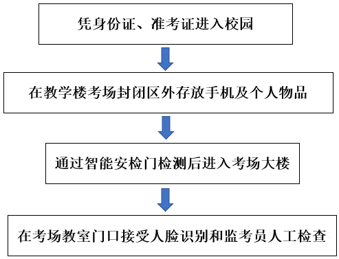 2. 考生如携带了手机,请务必提前到达教学楼外围,由考生本人将手机存入指定手机柜,然后取走钥匙,通过智能安检门检查后进入考场封闭区,考试结束后考生本人取回手机。