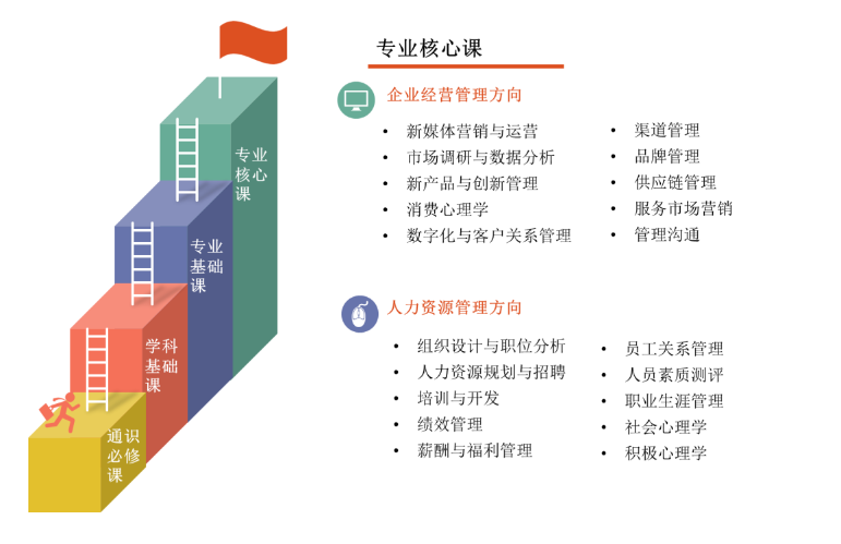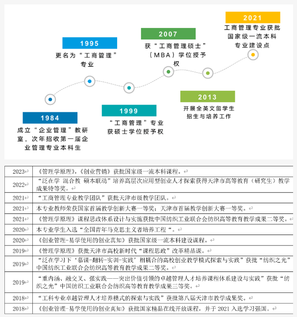 本专业以厚基础、宽口径、强技能、重实践为特色,以培养适应新时代中国特色社会主义发展需要,掌握完备和扎实的管理学科知识,具备科学思维和批判性思维,能够运用管理技能解决多样化管理实践问题的高质量人才。在数字智能化时代培养具有国际化视野、创新创业意识与团队精神,具备较强的管理实践能力与沟通技能。学生毕业后,可在各类企(事)业单位从事管理类工作,就业前景广阔。 02.专业概况 作为国家级一流本科专业建设点及工商管理一级学科硕士学位授予权学位点,工商管理专业定位于面向国家、服务于京津冀地区工商管理领域。以企业经营管理和人力资源管理为培养核心,以创新创业意识培养为特色,注重学生企业家精神、全球化视野和社会责任及领导力的提升,为学生搭建完备的商科认知体系,强化适应新兴行业的管理技能训练,培养具有良好管理素养与创新开拓精神的专业型管理人才。 本专业统筹发展学生的管理思维、知识与技能,构建战略与运营、市场营销、人力资源管理和创业管理四个完整的知识模块,对学生的商科素养进行全面培养。战略与运营模块为学生奠定战略思维和判断力;市场营销模块培养学生市场调研、行业分析和营销策略的专业能力;人力资源管理模块培养学生对人才的价值识别、价值评估和价值分配的专业能力;创业管理培养学生的创新思维、创业知识和技能。 工商管理专业设置企业经营管理和人力资源管理两个专业方向。 03.专业特色 工商管理专业以企业经营管理“思维、能力、技能”一体化综合素质的培养为本。通过专业课程、实践教学、实践平台、合作项目等载体,带领学生理解和掌握科学管理的理论知识与实践技能。 工商管理专业注重学生思维能力的培养。通过课程中的思维训练、课堂案例讨论分析、课后作业,结合考核评价来塑造学生的批判性思维。以创新实践项目和竞赛项目为基础培育学生创新思维。 工商管理专业强调多元管理能力的培育。通过战略与规划、公司治理、组织结构、企业文化等来培养学生的顶层设计能力;通过生产运作管理、物流管理、信息管理、市场营销、财务管理、人力资源管理等来培养学生的职能管理能力;通过创新管理、创业管理、创业营销、商业计划书、微创路演、“年轻有为工作室”、DSMB(Do Small Make Big)和“我来当”等实训项目等让学生体验管理创新实践的激情和乐趣,引导学生在“学中做,做中研”。通过项目管理、技术经济分析、项目投资与评估等来培养学生的项目运营能力。通过运筹优化、企业运营与大数据分析、区块链、Python语言等知识培养学生的智能化管理能力。 工商管理专业以专业技能为抓手。通过企业经营管理和人力资源管理两个专业方向的学习,全面掌握专业管理技能,覆盖从市场调查、方案制定、制度设计、流程优化、执行推广、评价考核等整个管理过程的技能模块。 04.专业核心课程 在工商管理专业培养计划的基础上,根据数智化浪潮下涌现出的社会需求新特点,升级了新媒体营销与运营为核心的课程。企业经营管理和人力资源管理两个方向各包含数十门专业核心课。 05.师资队伍 本专业师资队伍雄厚,拥有专任教师 31 人,其中教授 6 人,副教授 11 人,具有博士学位教师 22 人。拥有国家级创业导师 2 人,天津市“五个一批”人才 1 人,天津市 “131”人才 3 人,香港桑麻奖教金1人,天津市教工先锋岗等其他市级以上获奖教师11人。70% 的教师具有丰富的企业管理工作经验。 06.专业发展大事记与所获荣誉 07.科研与实践平台 自“十三五”以来,工商管理专业教师主持在研国家哲学社会科学基金项目、教育部人文社会科学项目、天津哲学社会科学项目、天津市战略发展规划项目等20多项。近5年来,本专业教师共发表学术论文169篇。本科学生参与的科研项目超过50项,累计参与各类科研项目100余项,其中国家社科项目3项,国务院各部门项目10余项,省部级项目40余项,企事业单位合作项目50余项。 工商管理专业以浸润式教学方法为手段、开放式创新实验平台为基础、学生课外学科竞赛实践为辅助,以MECLUB大学生实践俱乐部为组织,以学生实践动手能力培养为出发点,开创“赛中学,学中做,做中研,研中悟”的商科专业创新型人才培养模式,总结出有针对性的行动学习教学方法,探索新工科背景下商科创新型人才实践培养体系,构建了大学四年不断线的商科学生创新实践能力培养体系。成果荣获第四届西浦全国大学教学创新大赛一等奖(2019年),“纺织之光”中国纺织工业联合会纺织高等教育教学成果一等奖(2021年),天津市教学成果二等奖(2022年)。 工商管理专业以“互联网+”大环境下的企业真实问题为行动基础,贯穿“理论教学与实践教学相融通,线下教学与线上教学相融合,课堂内教学与课堂外教学相结合”的三大教学策略,先后与上海威亮、简佰格、西柚科技、七琪美甲等20多个企业深度合作,通过融合式混合教学模式来全面激活学生学习的积极性、主动性、参与性和责任感,全面锻造新工科院校不同专业学生成为地方经济和社会发展之有用的工匠人才。创建年轻有为工作室,强调基于优势的职业潜力挖掘,培养学生基于企业真实问题解决复杂问题的能力,基于项目制,校企共育,跨学科、年级、专业组建学生团队,将专业能力与创业能力结